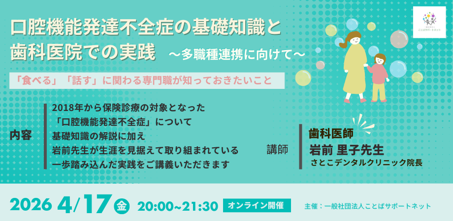 「食べる」「話す」などのお口周りの心配事があるお子さんに関わる際には必須の知識である口腔機能発達不全症について、歯科医師の先生に基礎知識と歯科医院での実践についてご解説いただきます。