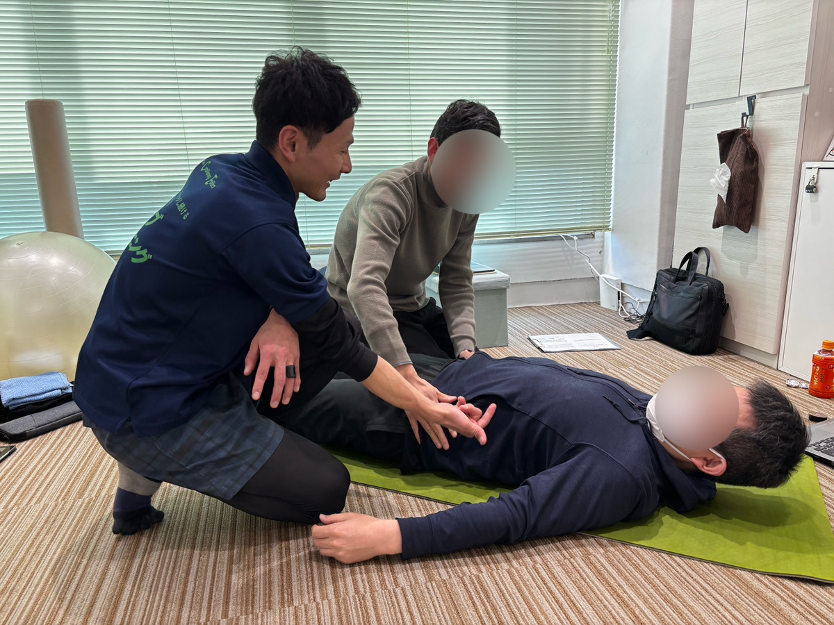 ①脱力しやすい姿勢や状況を整えるための胸郭・肩甲帯のコンディショニング方法の理解と実践 ②ストレッチなどの施術や補助などのために相手に触れる場合や、トレーニング時に力みが出てしまう場合に対する対処方法