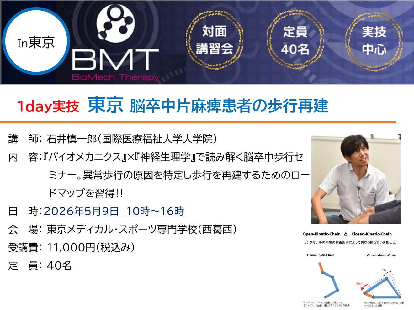 「装具に頼るしかないのか?」、「反張膝が止まらない」、「麻痺側の振り出しが重い・・・」。そんな臨床の行き詰まりを打破するのは、感覚的な介入ではなく徹底した「力学的根拠」と「脳の可塑性」の統合であると考えます。この講習会では、脳卒中片麻痺にフォーカスし、物理現象であると同時に脳の出力の結果である歩行を多角的に理解し、自信をもってアプローチできる評価・治療を習得する講習会となります。