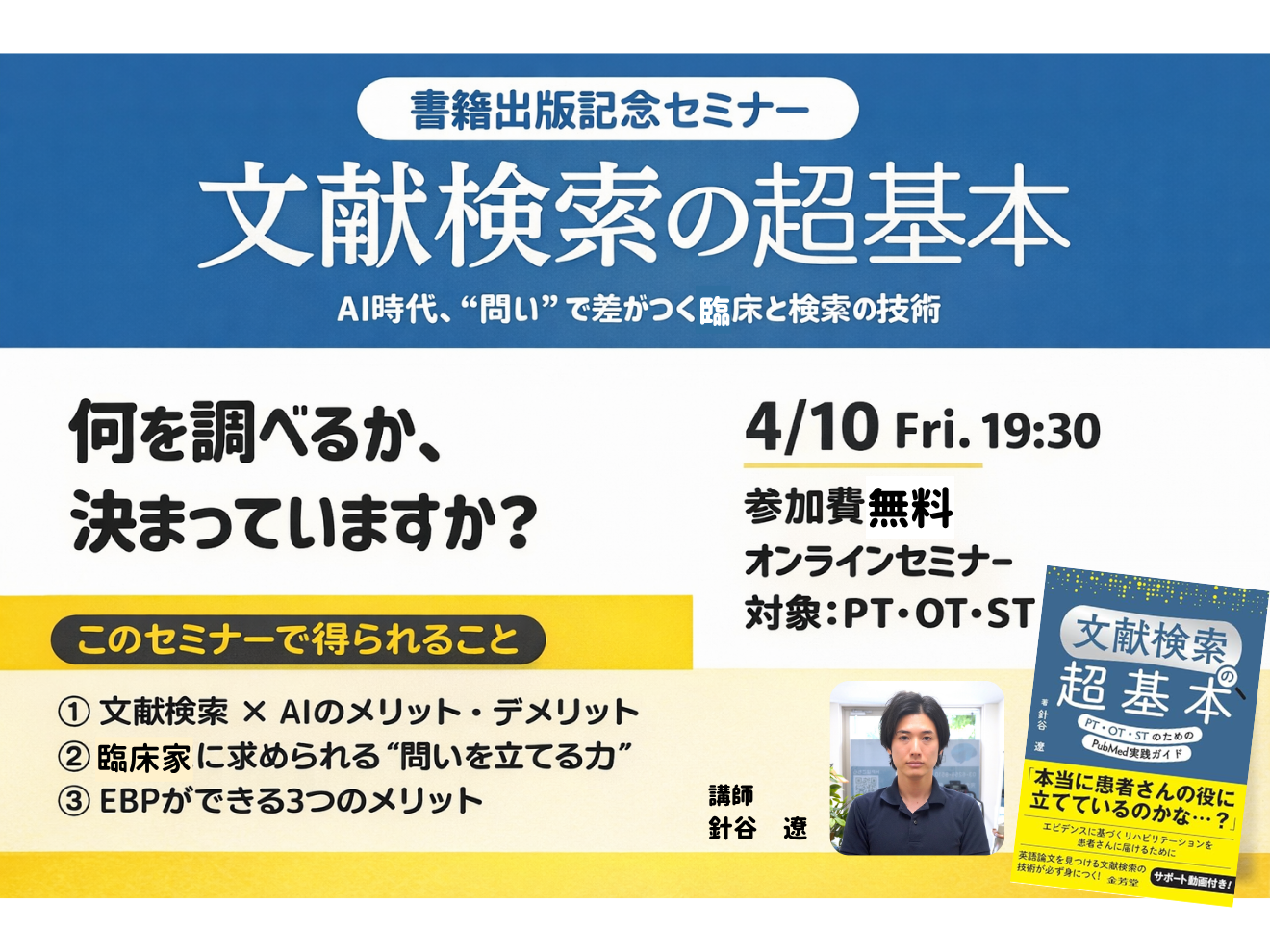 本セミナーでは、AI時代における文献検索の活用法と、その限界、そして臨床に活かすために必要な「問い(イシュー)を立てる力」について解説します。
