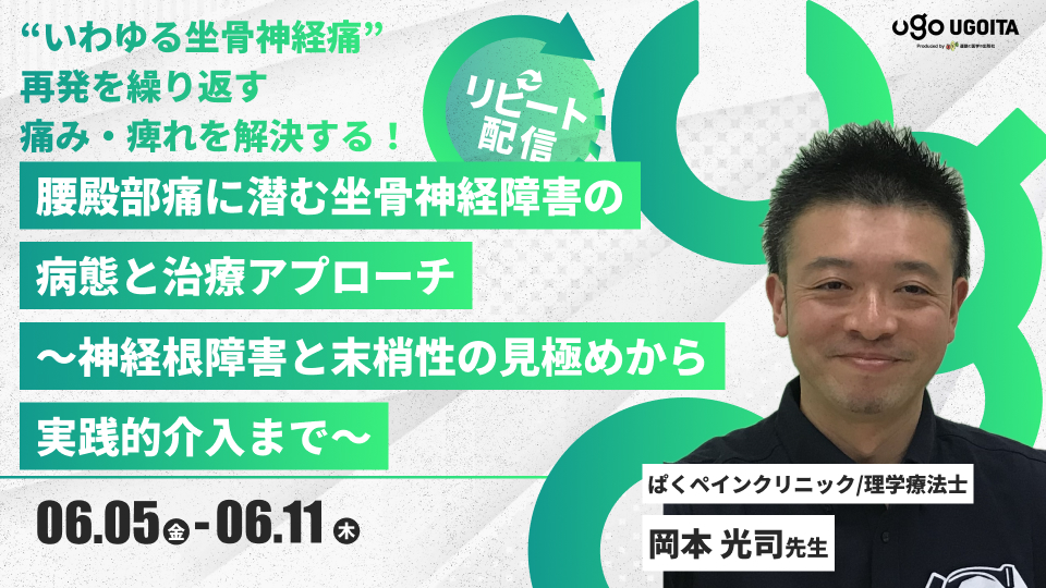 【岡本光司先生】腰殿部痛に潜む坐骨神経障害の病態と治療アプローチ〜神経根障害と末梢性の見極めから実践的介入まで〜(リピート配信)