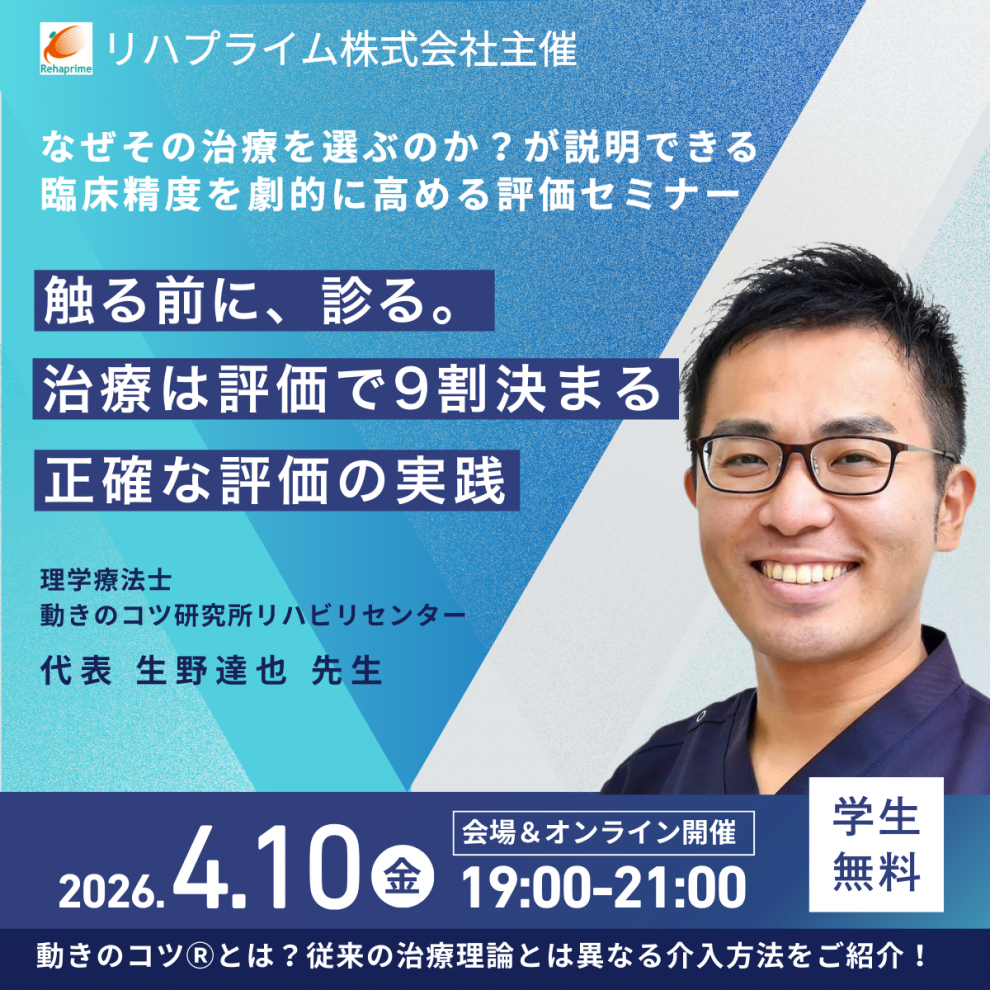 本セミナーでは、動きのコツ研究所リハビリセンター 代表の生野達也氏が12年間、自費リハビリの臨床現場で磨き続けてきた 「触る前に、診る」という評価軸と、治療につながる評価の組み立て方を、体系的にお伝えします。