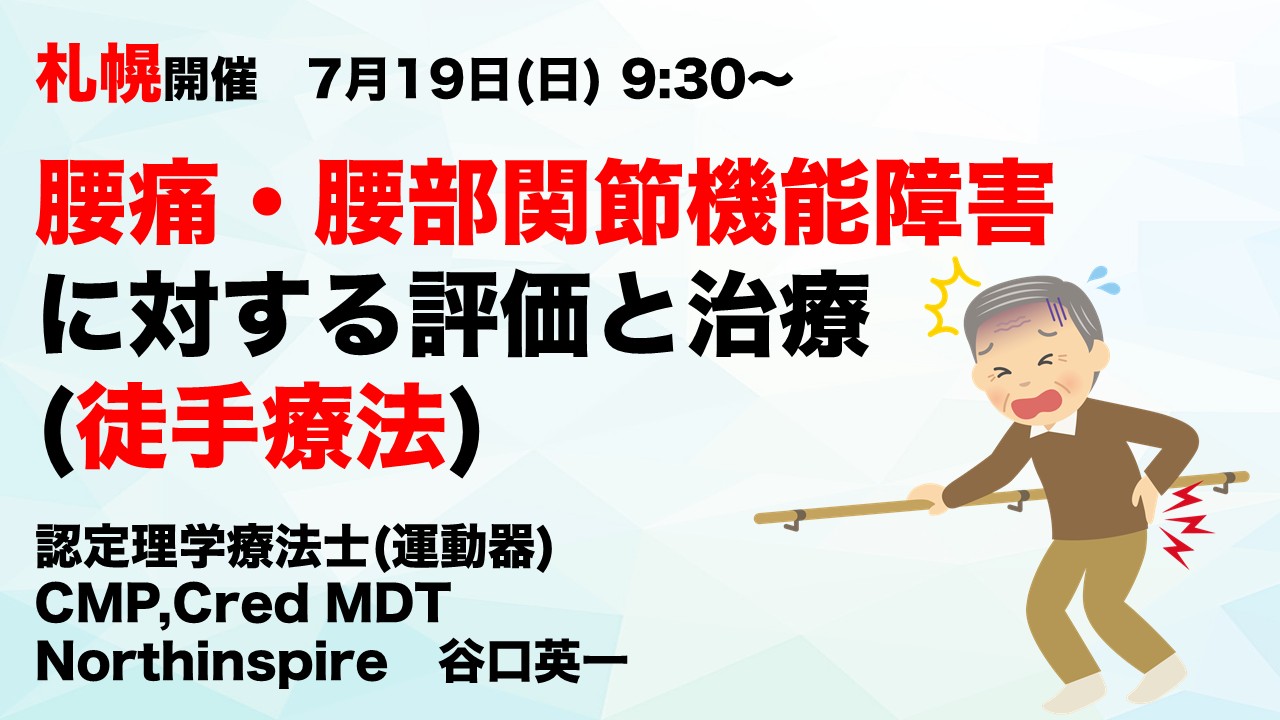 この度、Northinspireでは7月に札幌で「腰痛・腰部関節機能障害に対する評価と治療 ~腰痛と腰部可動域制限に対する徒手療法~」というタイトルで研修会を開催致します。臨床的に腰痛症例では腰部可動性の低下を伴っていることが多いです。