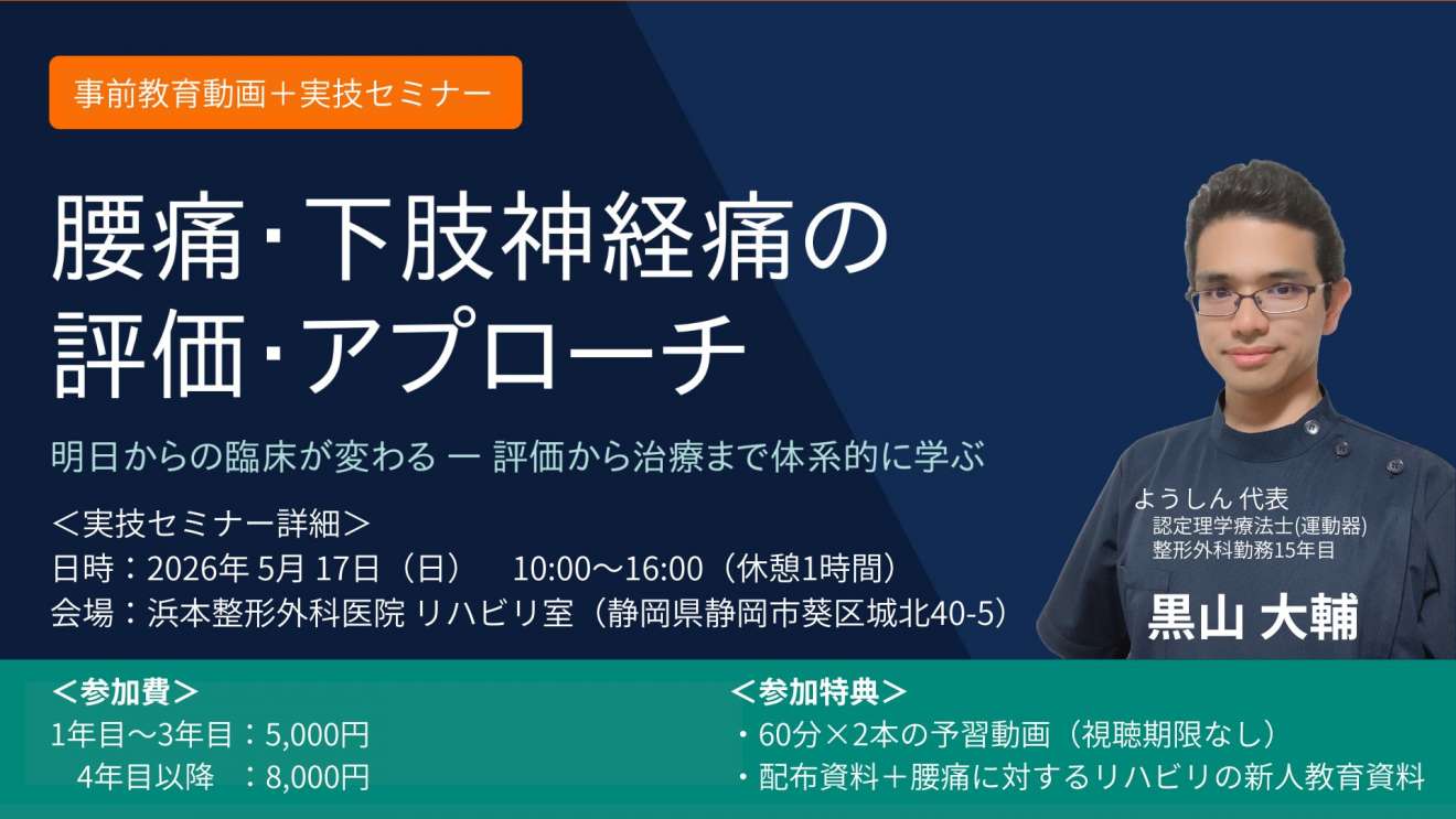 整形外科勤務15年目。浜本整形外科医院にて整形外来・通所リハに従事しながら、若手セラピストの育成に長年取り組む。研修会運営組織「ようしん」代表として、"現場で本当に使える技術"を伝えることにこだわったセミナーを主催。