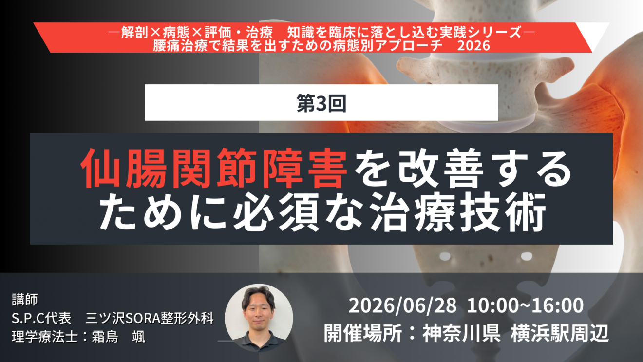 仙腸関節障害を改善するために必須な臨床思考、評価、治療技術まで全てお伝えする内容になります。