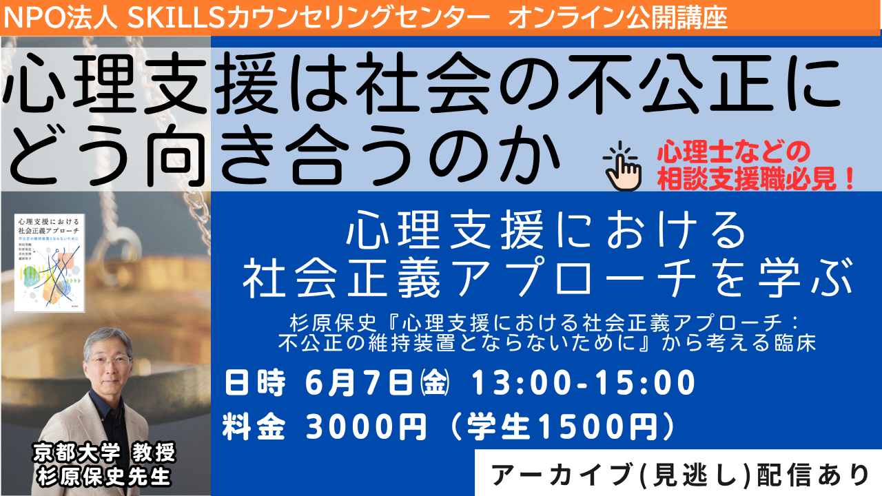 本研修では、杉原保史先生が編集に関わった書籍『心理支援における社会正義アプローチ:不公正の維持装置とならないために』を手がかりに、心理支援における社会正義の視点について学びます。