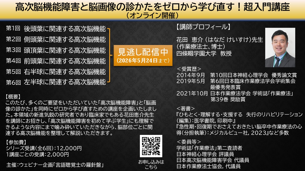 本領域の新進気鋭の研究者であり臨床家でもある花田恵介先生を講師にお招きし、「高次脳機能障害を初めて学ぶ学生」にも理解できるような内容にまで噛み砕いていただきながら、脳部位ごとに関連する高次脳機能を整理して解説いただきます。