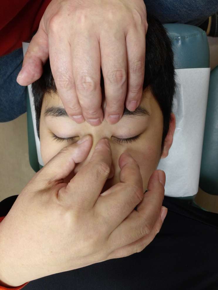 顔面頭蓋の症状については滲出性中耳炎や花粉症へのアプローチが特に有用であると考えています。これらの症状の患者さんでは篩骨や頬骨、側頭骨の可動性が減少しています。これらの骨にごく弱い持続的な力(5グラム)をかけて可動性を回復させると繰り返し起こる炎症が軽減されます。口蓋骨を調整することで迷走神経の咽頭枝の機能が改善されるようでこちらも鼻の症状に有効です。いちど蓄膿症の手術後50年に及ぶ頭痛というのを拝見したことがありますが、その時も口蓋骨の調整が有効でした。顎関節症のケアでは咬筋の緊張を緩めることに腐心することが多いのですが、側頭骨の動きが悪ければ緊張は再発しますし、上顎骨に問題があるときも咬筋へのアプローチだけでは奏功しません。
