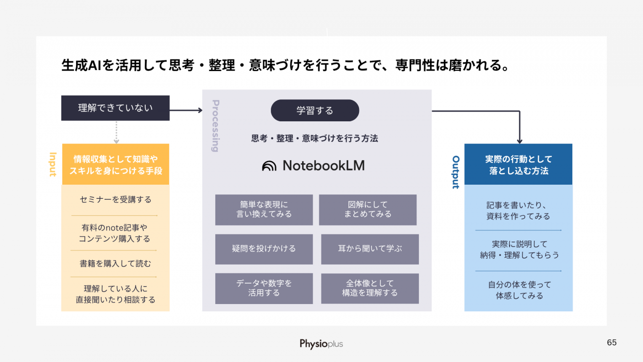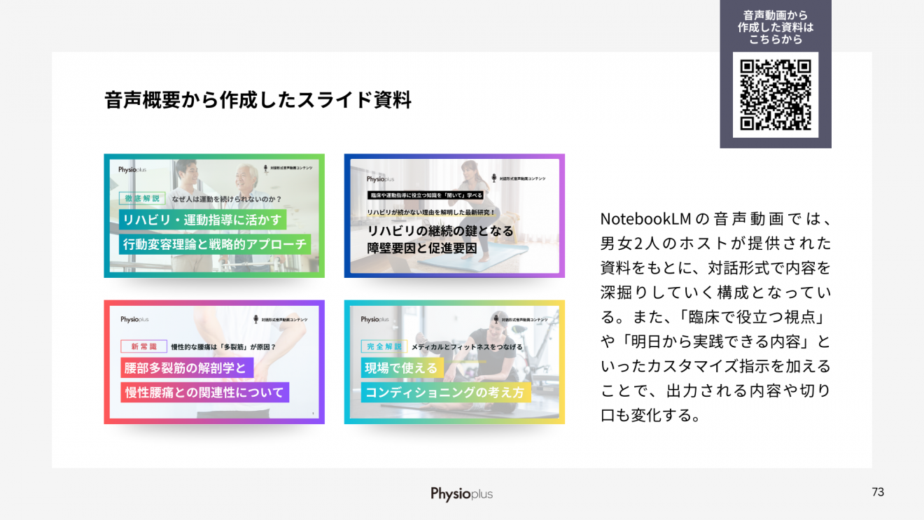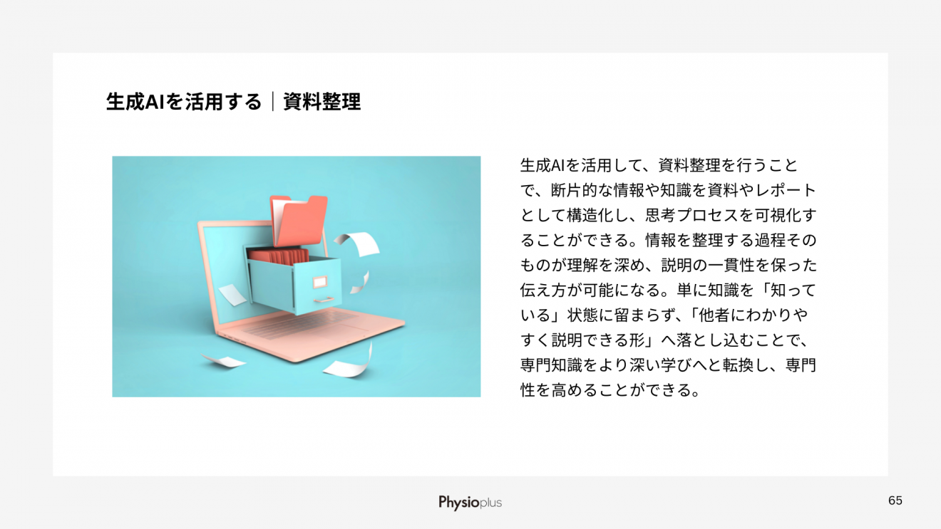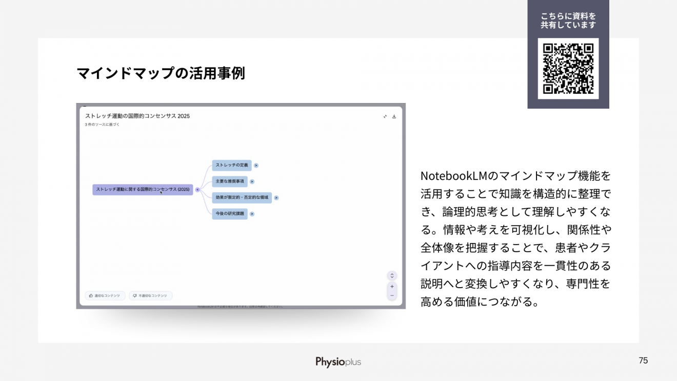 生成AIツールであるNotebookLMの基本的な使い方から、臨床や運動指導の現場で活かせる実践的な活用方法までを学べるオンラインセミナーです。