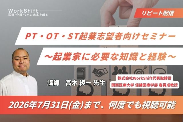 リピート配信 PT・OT・ST起業志望者向けセミナー 〜起業家に必要な知識と経験〜(123分)(2026年7月31日まで視聴可能) リピート配信 PT・OT・ST起業志望者向けセミナー 〜起…
