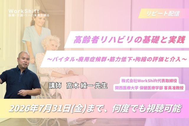 リピート配信 高齢者リハビリの基礎と実践 〜バイタル・廃用症候群・筋力低下・拘縮の評価と介入〜(122分)(2026年7月31日まで視聴可能) リピート配信 高齢者リハビリの基礎と実践 〜バイタル・廃用…