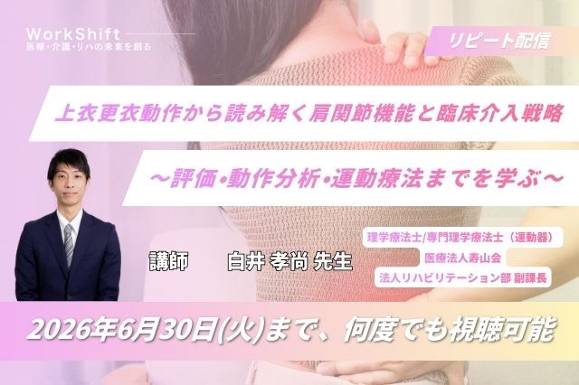 リピート配信 上衣更衣動作から読み解く肩関節機能と臨床介入戦略 ~評価・動作分析・運動療法までを学ぶ~(118分)(2026年6月30日まで視聴可能) リピート配信 上衣更衣動作から読み解く肩関節機能と臨床介入…