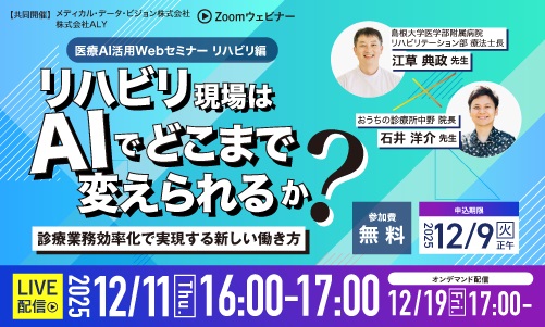 医療AI活用Webセミナー・リハビリ編「リハビリ現場はAIでどこまで変えられるか?」 ~診療業務効率化で実現する新しい働き方~ 医療AI活用Webセミナー・リハビリ編「リハビリ現場はAI…