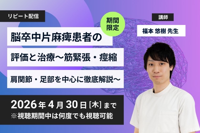 リピート配信 脳卒中片麻痺患者の評価と治療〜筋緊張・痙縮・肩関節・足部を中心に徹底解説〜(122分)(2026年4月30日まで視聴可能) リピート配信 脳卒中片麻痺患者の評価と治療〜筋緊張・痙縮・…