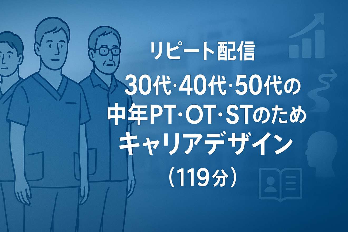 リピート配信 30代・40代・50代の中年PT・OT・STのためのキャリアデザイン(119分)(2026年5月31日まで視聴可能) リピート配信 30代・40代・50代の中年PT・OT・ST…