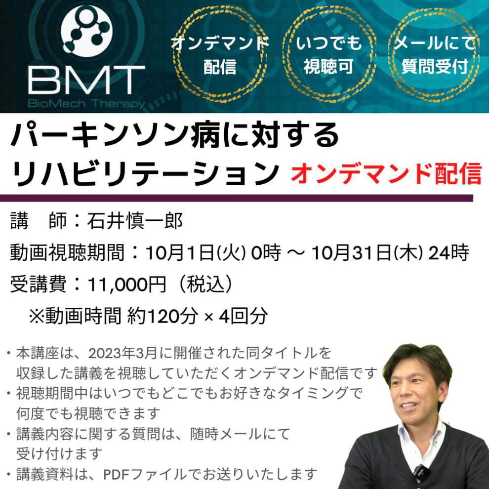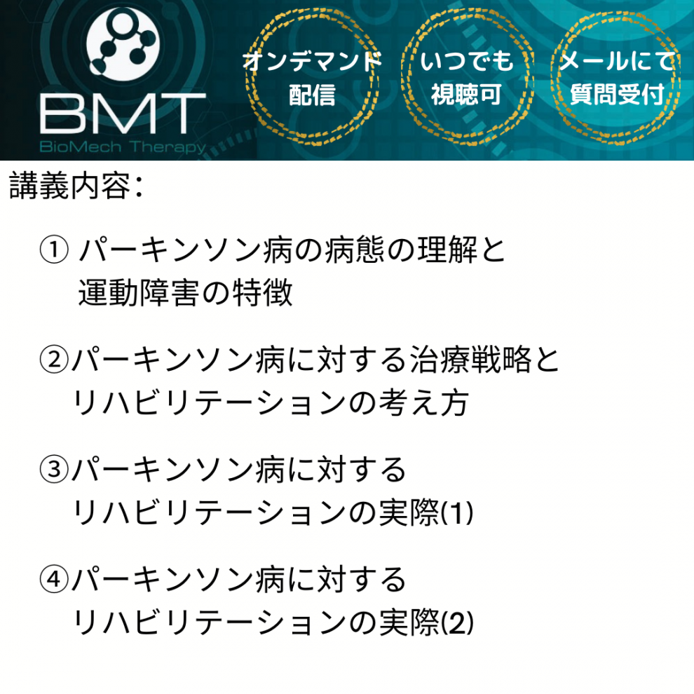 今回、BMTオンライン講習会に参加されていた方から、「パーキンソン病に対するリハビリテーションについて講義を行ってほしい」というご依頼を受けました。私自身もデイサービスでパーキンソン病の利用者さんを見る機会が多く、様々な視点からの介入が重要だと感じています。 本講習会では、より実践的な内容を中心に講習をしようと考えています。