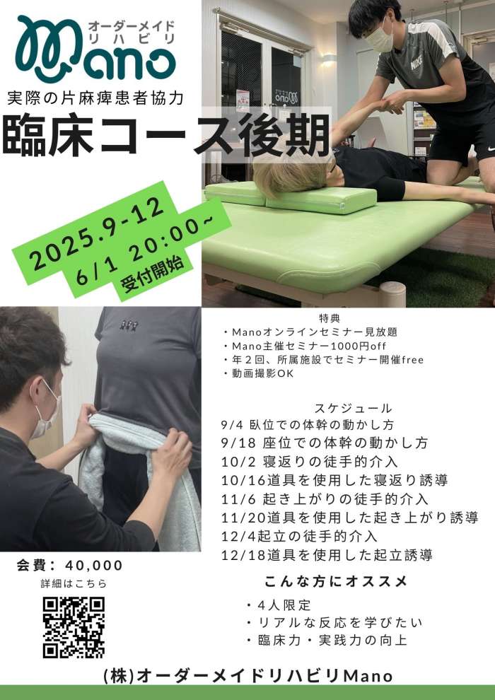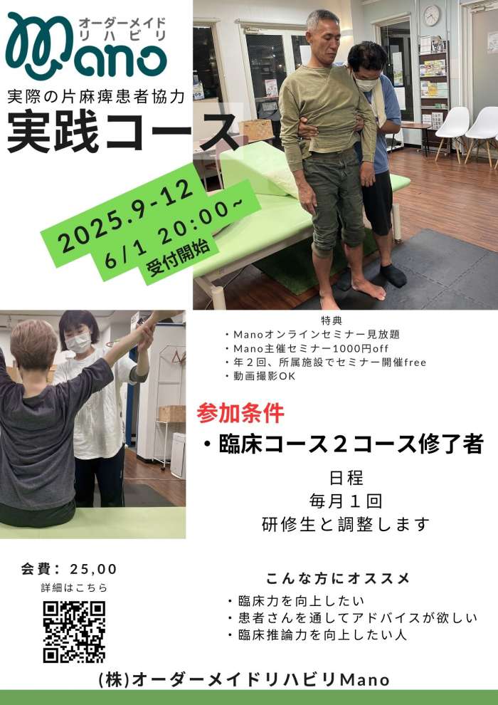 受講生を主体に一緒に臨床推論を進めながら、介入をマンツーマンで行うコースです Manoの基礎的な知識と技術があることを参加条件として、臨床コースが修了者のみであること 質の担保のため、1名限定となります!