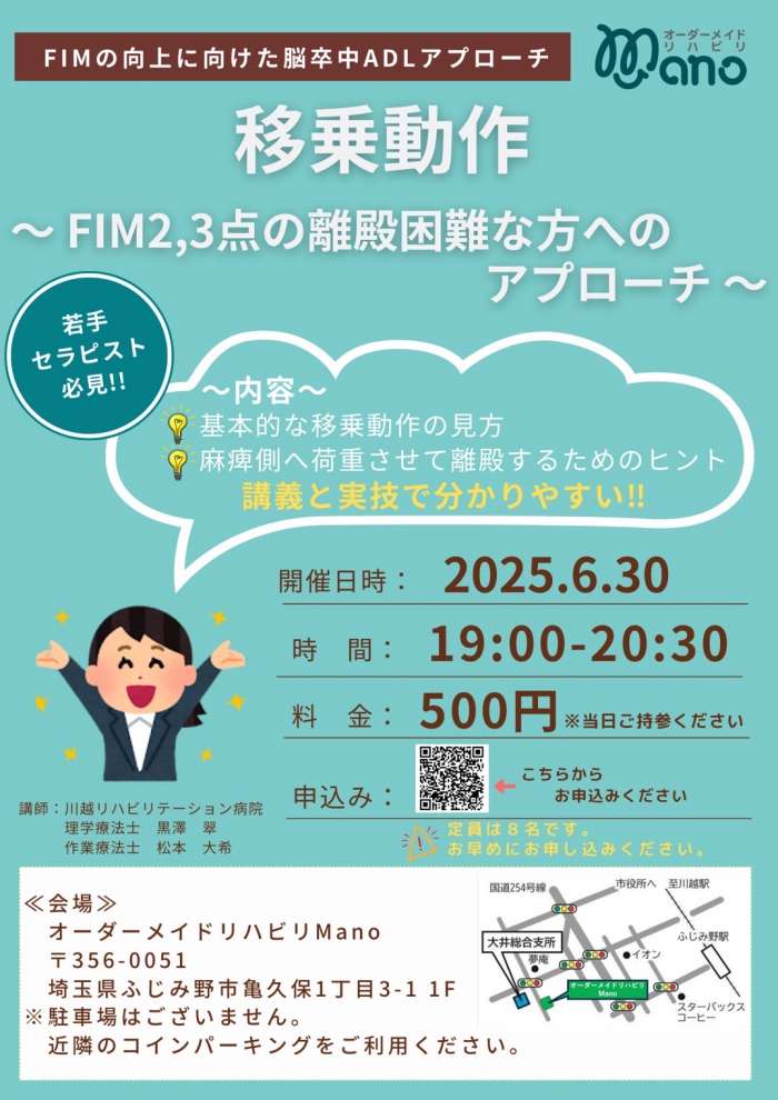 Manoアシスタントが行う勉強会となります。 昨今FIMの向上が求められる中で特に若手の職員から困っているとの話を多く聞き開催する運びとなりました。 全6回第1回が6/30「移乗動作」 2月まで定期的に行なっているので是非参加してみてください