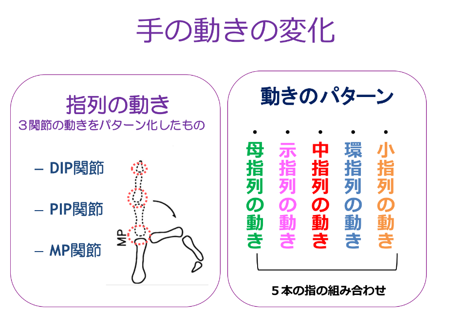 ・基本的な“指列の動き”、6種類を理解し、指の動きを読みとれる。