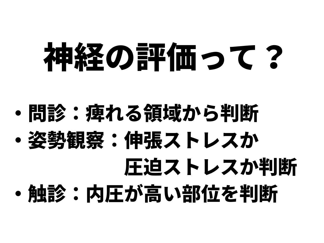 評価では神経組織がつくる関節可動域の抵抗感を体感できるようになります。また、問診からの推測と、整形外科テストや触診を交えて考察することで治療部位を特定していきます。アプローチでは神経周囲組織の解放による、神経症状の改善方法について伝えていきます。