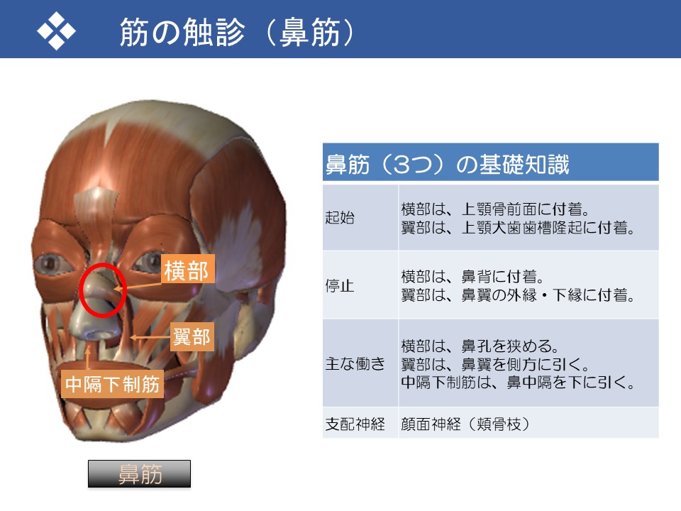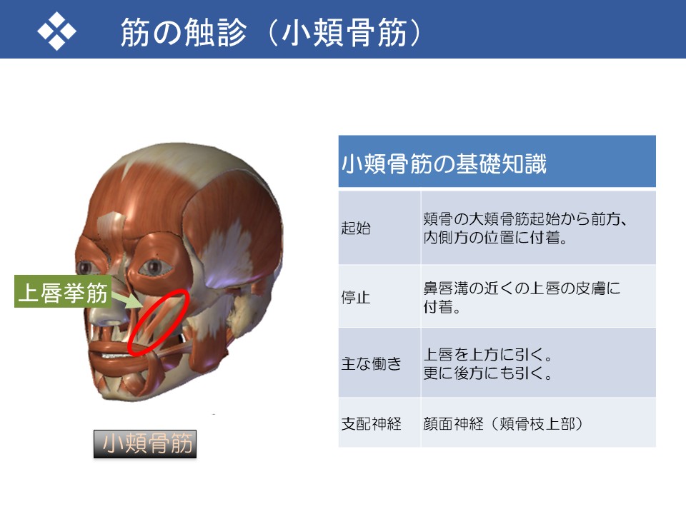 ・表情筋の起始・停止を把握しながら、主要な顔面筋の触診とアプローチを実践できる