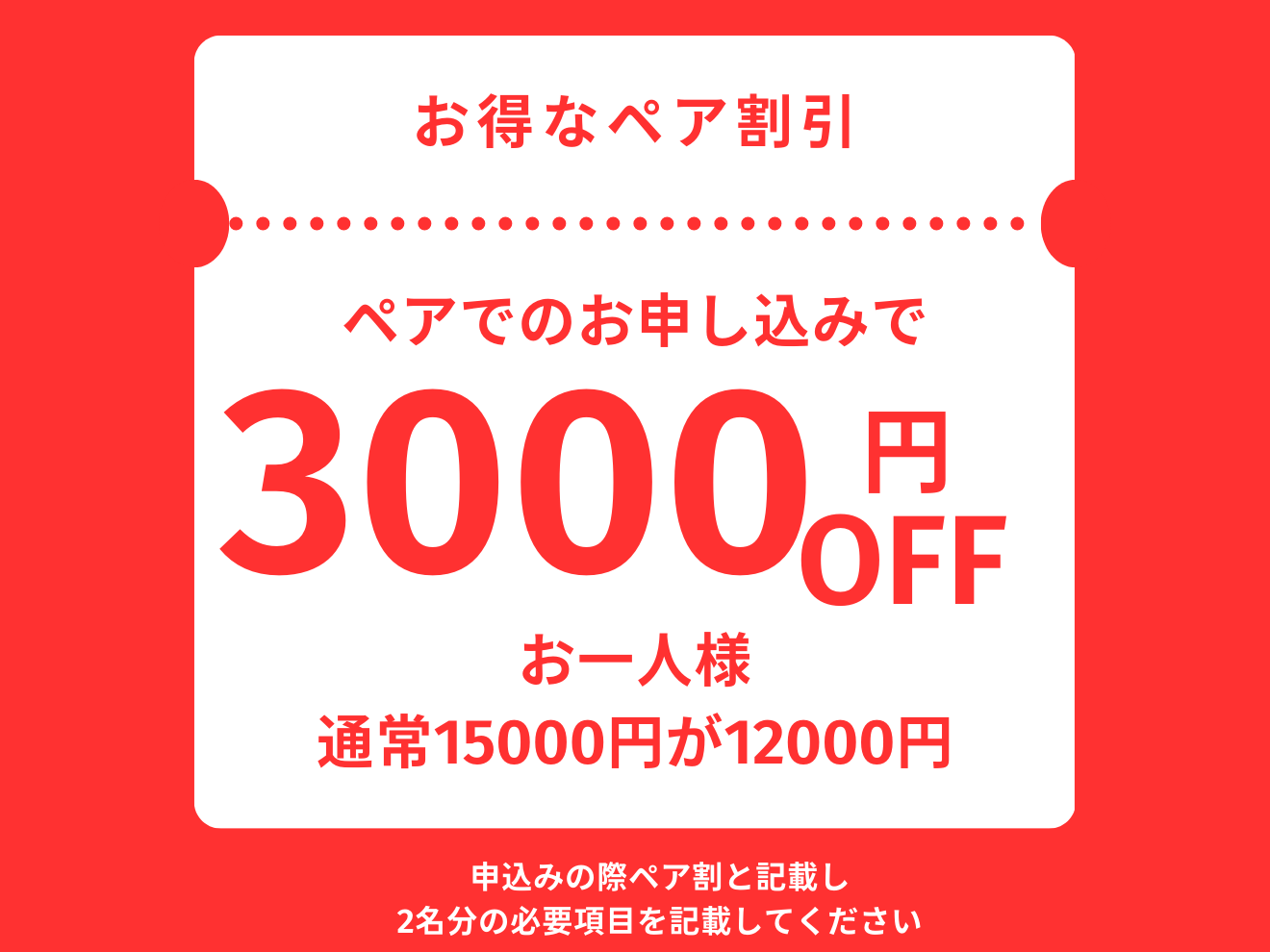 ペア申込で1人あたり12,000円(6,000円お得)