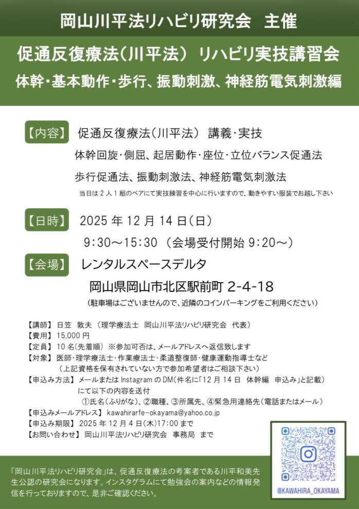 岡山県および周辺地域にて促通反復療法(川平法)の普及や情報発信、勉強会などを行い、地域に貢献していくことを目的とした、川平和美先生公認の研究会です。リハビリや川平法の治療相談、指導依頼など、お気軽にお問合せ下さい。
