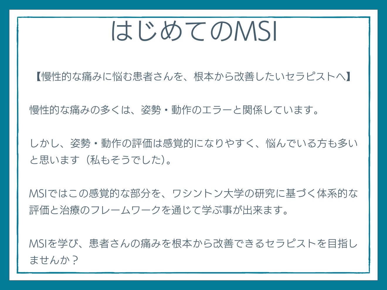 MSIを学ぶことで、患者さんの痛みの根本原因を特定し、再発を防ぐための的確なアプローチが可能になります。