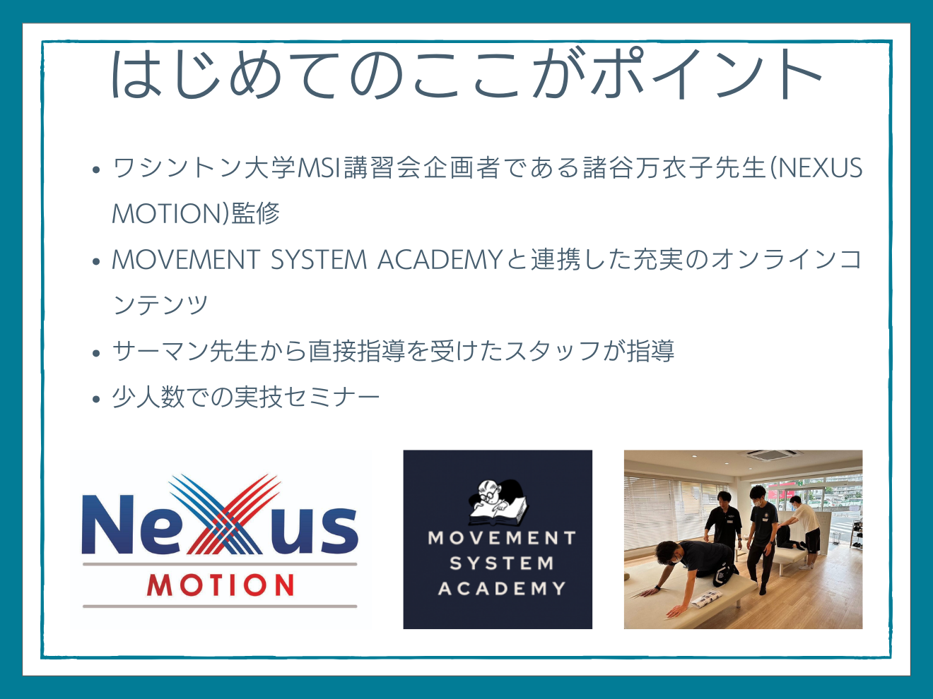 ・Movement System Academyと連携した充実のオンラインコンテンツ:座学はオンラインで、実技は対面で学ぶことができます。