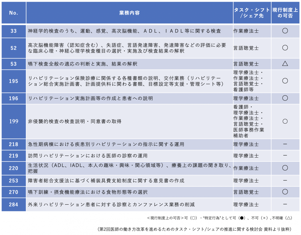 理学療法士、作業療法士、言語聴覚士がタスク・シフト/シェア先とされた事項については、下記の通り整理された。