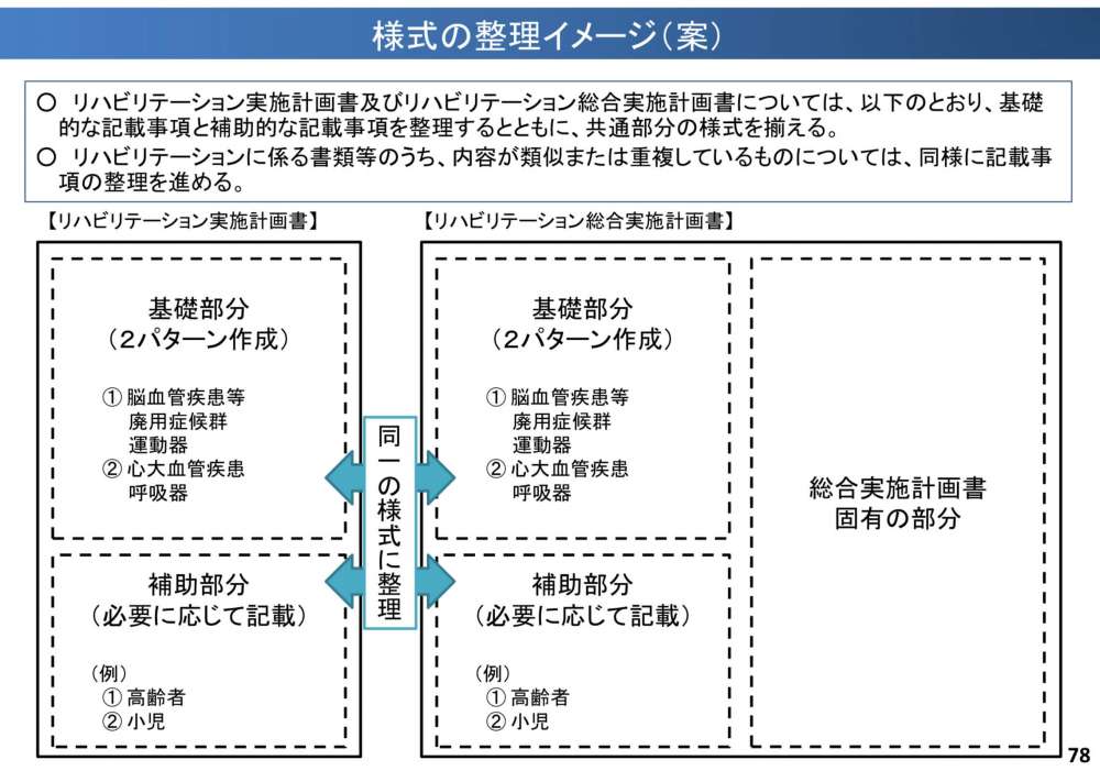 また、疾患別リハビリテーション料を算定するに当たり必要な「リハビリテーション実施計画書」と、リハビリテーション総合計画評価料を算定するに当たり必要な「リハビリテーション総合実施計画書」は、それぞれ準ずる様式が異なることや、小児の患者等については所定の様式では記載しにくい点が指摘されている。