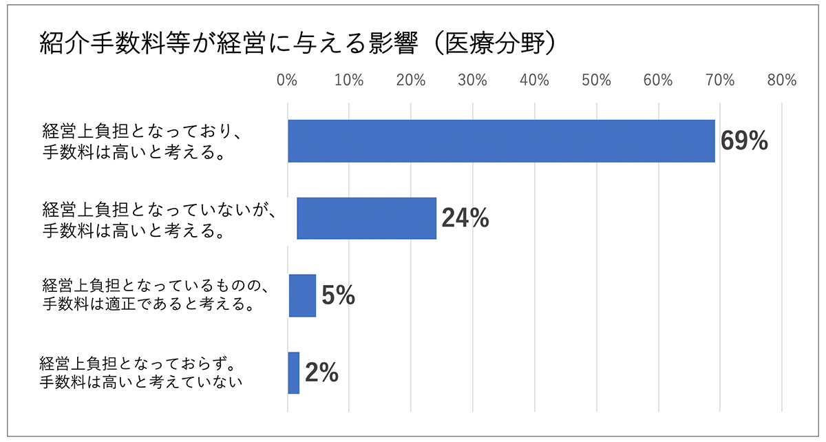 今回、厚生労働省職業安定局が実施した「医療・介護分野における職業紹介事業に関するアンケート調査(令和元年)」によると、医療分野での人材紹介に係る手数料が高額であり、経営上負担となっていると回答した事業所が7割(69.2%)となっていることが明らかとなった。