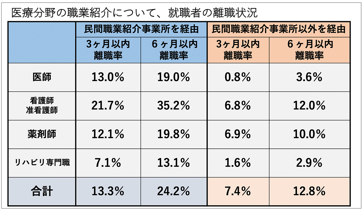 同調査は、職業紹介事業が適切に運営されているかなど調査することを目的に、令和元年6月〜8月にかけて求人事業所、求職者、職業紹介事業所を対象に実施。民間職業紹介事業所を経由して採用されたリハビリテーション専門職のうち約1割(13.1%)は6ヶ月以内に離職しているという結果が示された。
