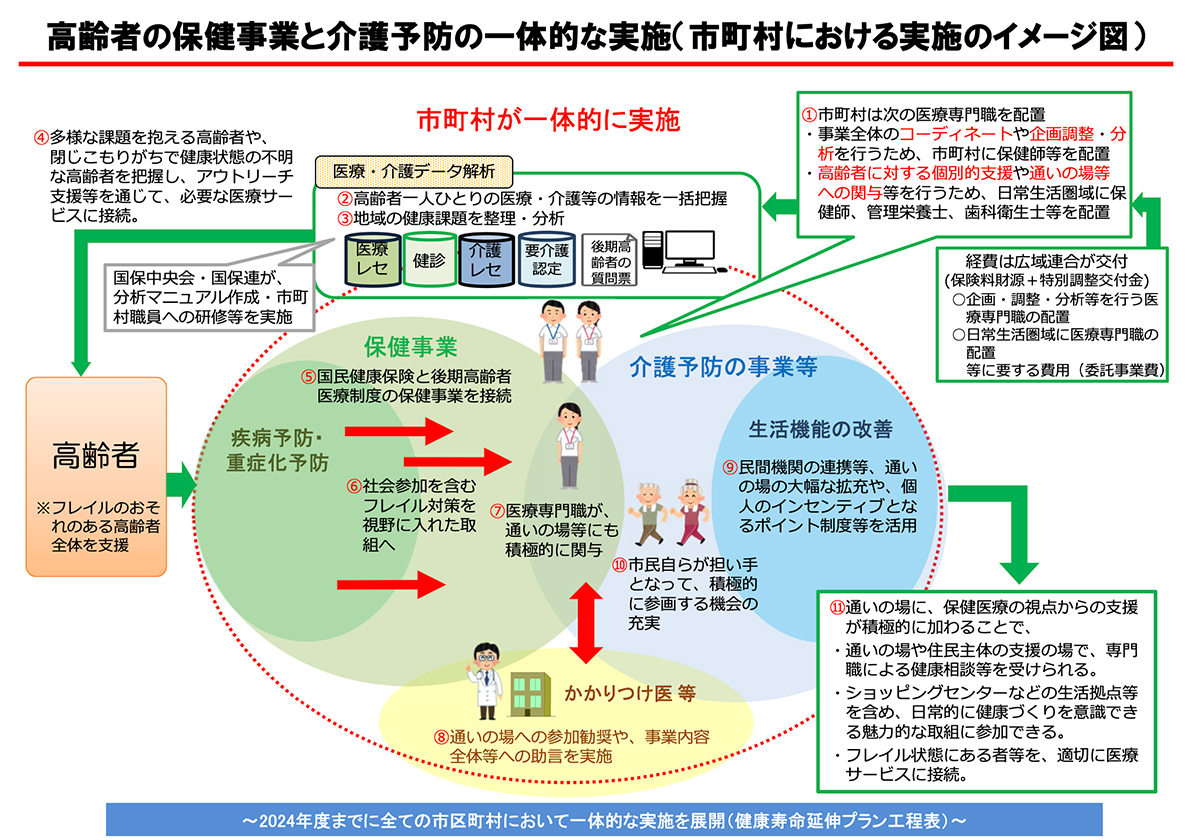 2020年度から後期高齢者を対象に行う健診でフレイルチェックが行われる。高齢者の保健事業と介護予防の一体的な実施は2024年度を目標に実施されることになっており、令和3年度介護報酬改定は、この一連の流れの中で、より予防や重度化予防、アウトカム評価に力が注がれると予想される。今後、改定に関わる論議が注目される。