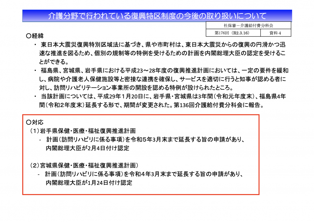 岩手県は令和5年3月末まで、宮城県は令和4年3月末まで、それぞれ保健・医療・福祉復興推進計画(訪問リハビリに関わる事項)を延長することが認定された。