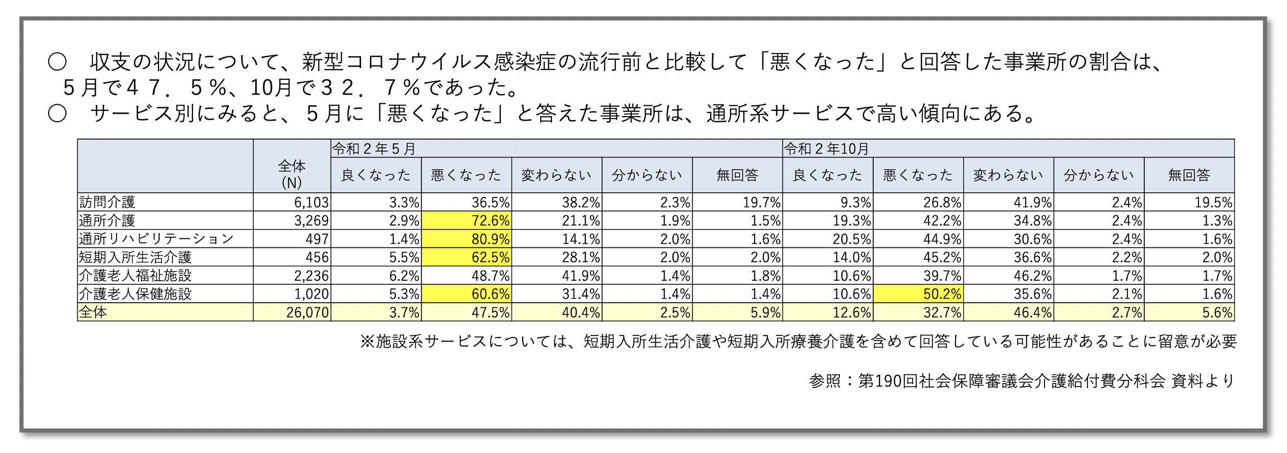 また、今回の介護事業経営実態調査では新型コロナウイルス感染症によるの影響は調査期間に含まれておらず別にアンケート調査を追加で実施。収支の状況について、新型コロナウイルス感染症の流行前と比較して「悪くなった」と回答した事業所の割合は、5月で47.5%、10月で32.7%であり、サービス別にみると