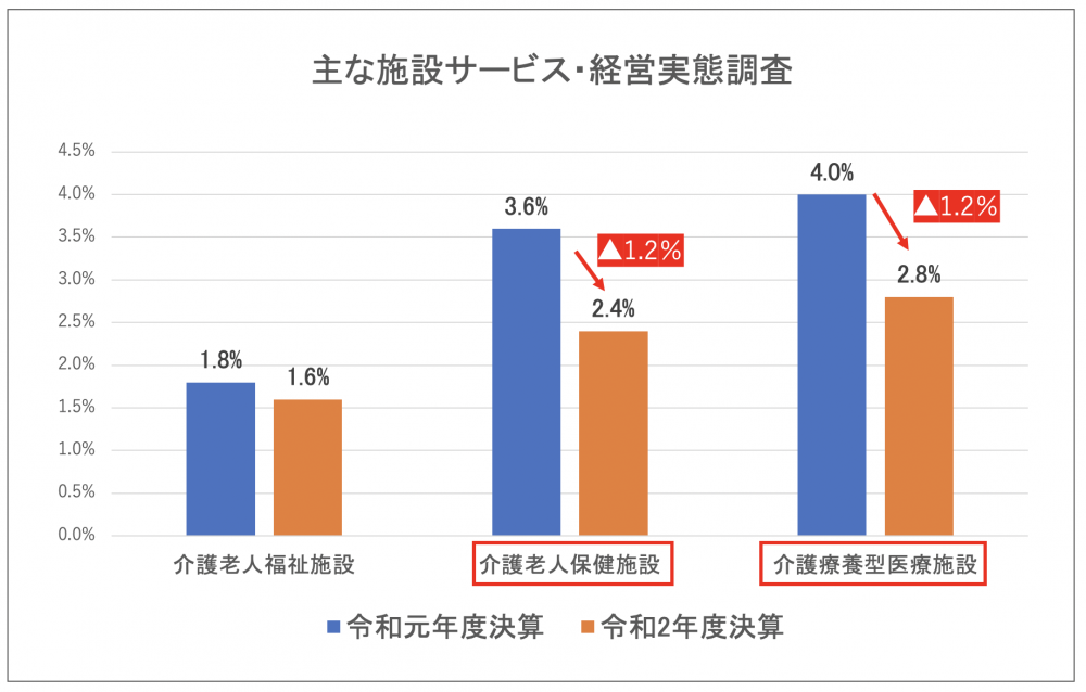 施設サービスは、介護老人保健施設は2.4%(1.2%ポイント減)、介護療養型医療施設は2.8%(1.2ポイント減)と事業収支の低下している。なお、介護医療院の令和元年度決算として5.2%となっているが、介護医療院は事業数が少ないため参考数値となっている。