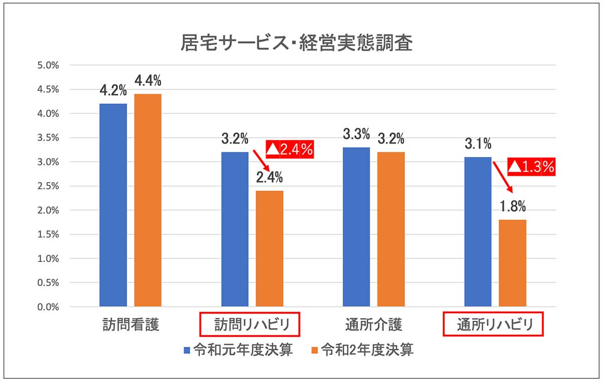 居宅サービスの収支差率を見ると、訪問リハビリテーションは2.4%(0.8ポイント減)、通所リハビリテーションは1.8%(1.3ポイント減)と事業収支の低下が目立つ。