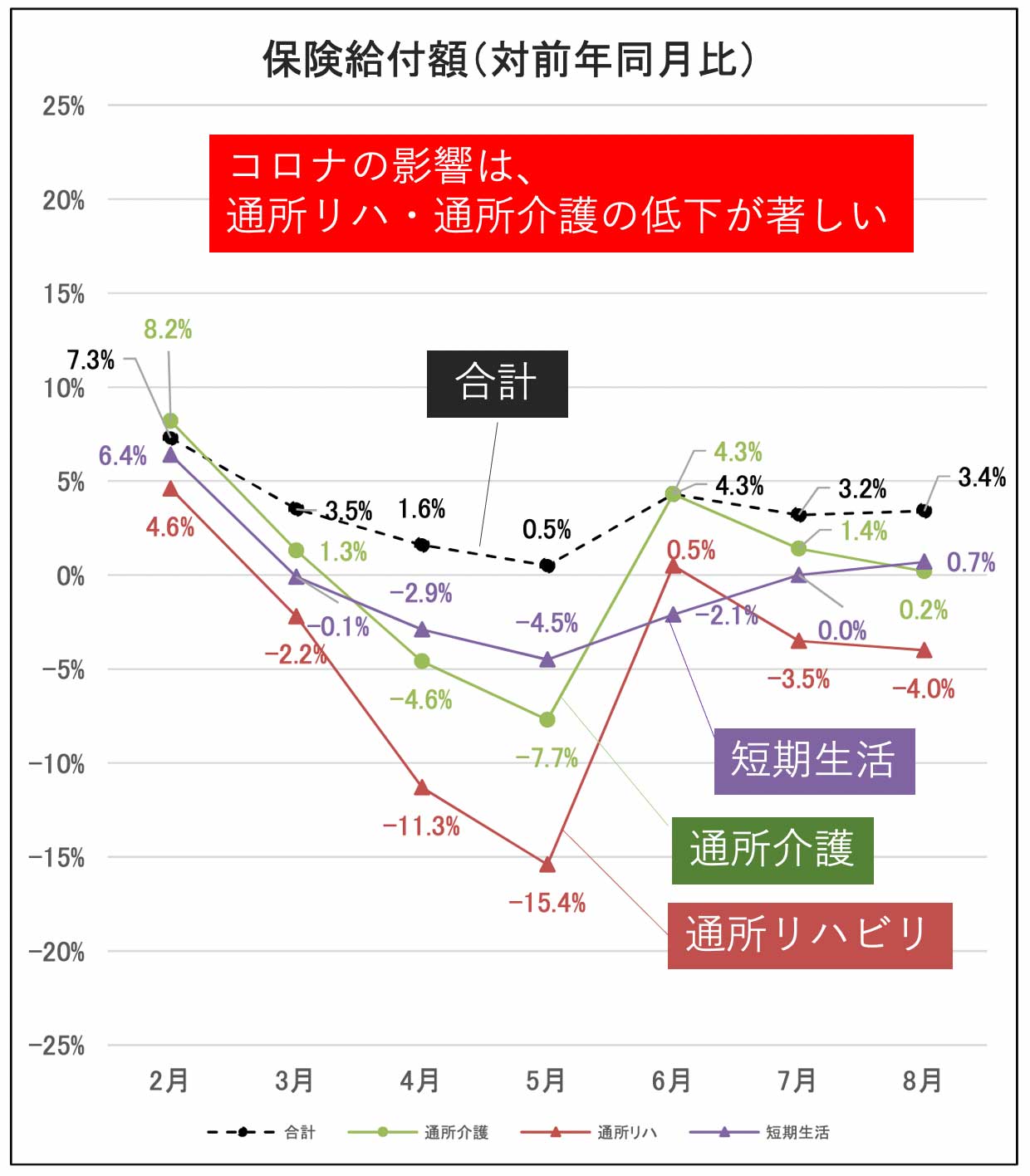 保険給付額も、通所介護、通所リハビリテーションの前年同月比の比較として大きく低下しており、コロナ感染拡大の影響が経営に与えるインパクトが大きいといえる。