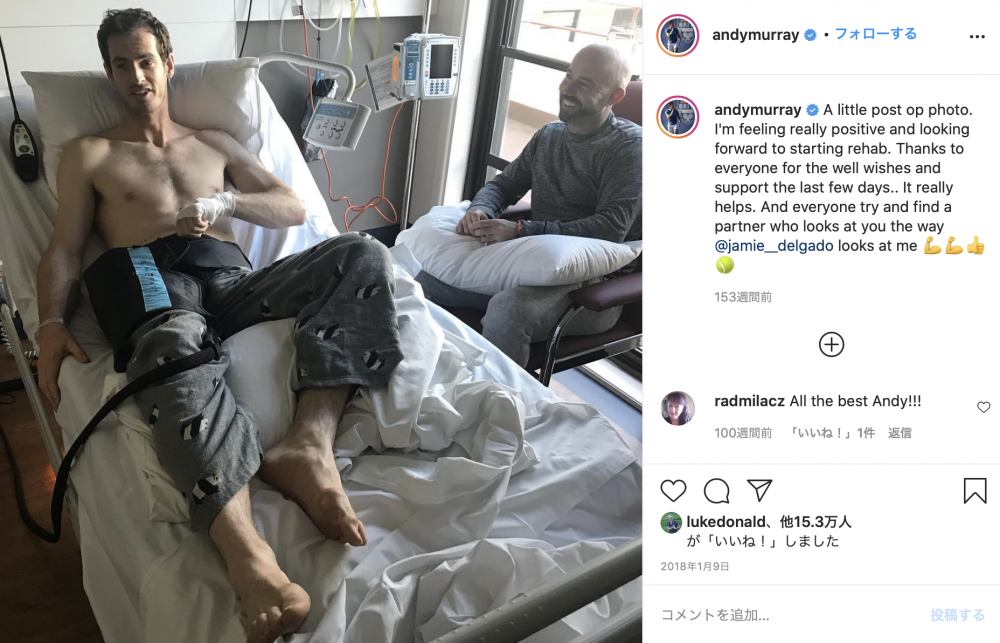 股関節の手術を終えたばかりのアンディ・マリーの様子(Instagramより)