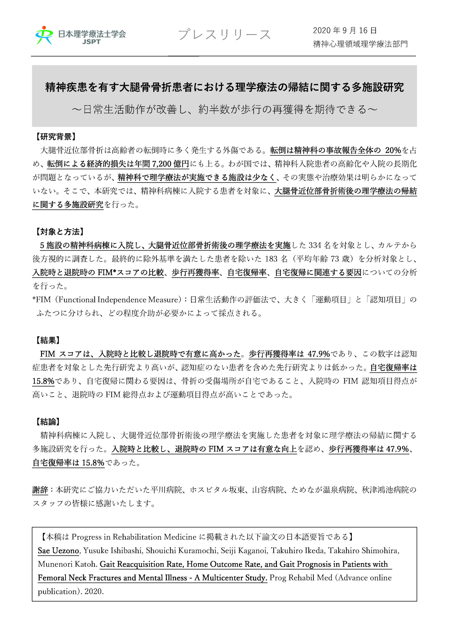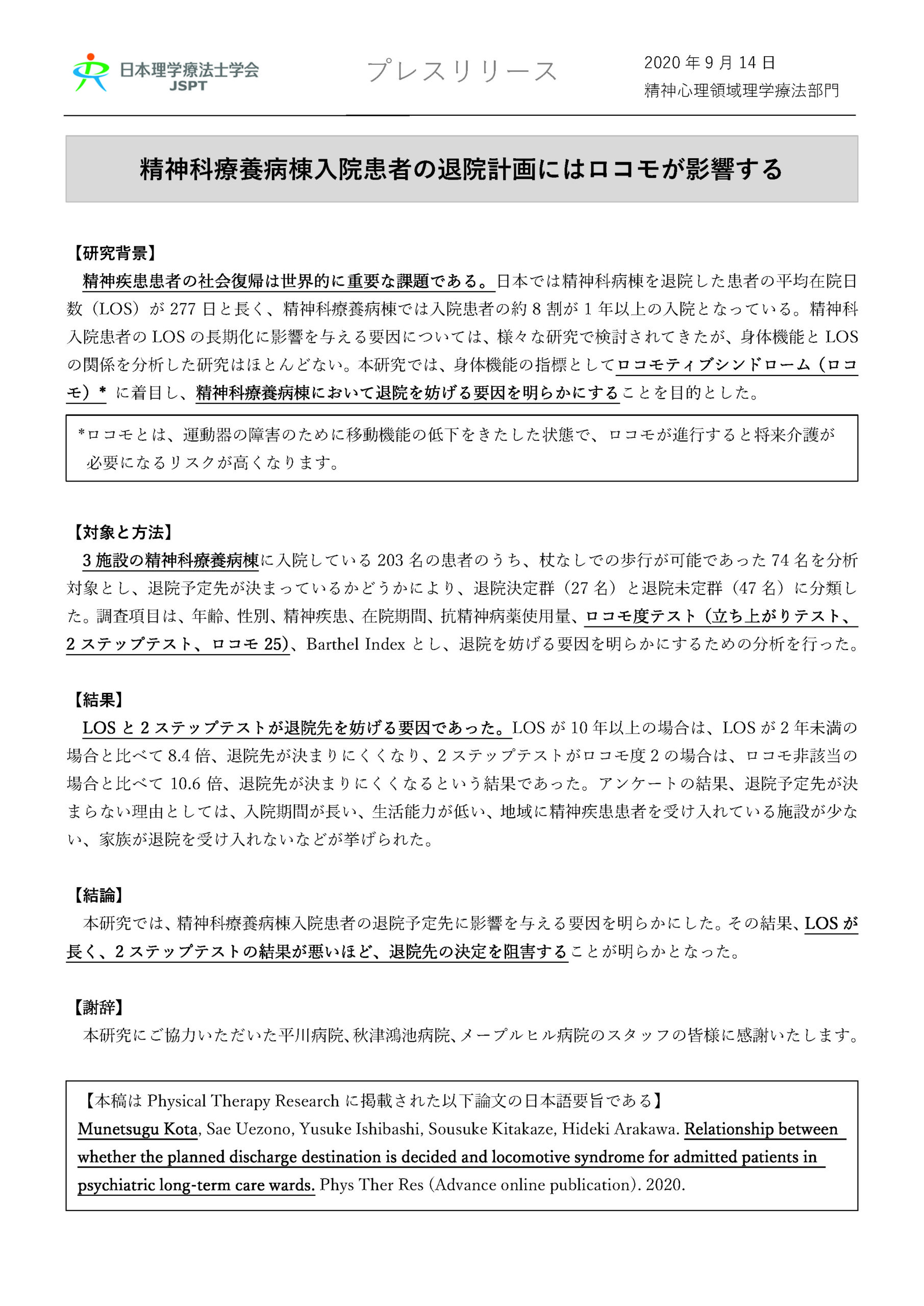 日本理学療法士学会の精神心理領域理学療法部門は、精神科療養病棟における患者に対して理学療法が効果がある研究報告についてプレスリリースした。