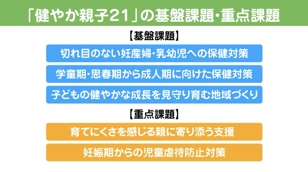 健やか親子21(第2次)は、全ての国民が地域や家庭環境などの違いに関わらず、同じ水準の母子保健サービスを受けられる社会を実現することを目標に掲げ、「切れ目のない妊産婦・乳幼児への保健対策」「学童思春期から成人期に向けた保健対策」「子どもの健やかな成長を見守り育む地域づくり」の3つの基盤課題と、「育てにくさを感じる親に寄り添う支援」「妊娠期からの児童虐待防止対策」の2つの重点課題を設定している。