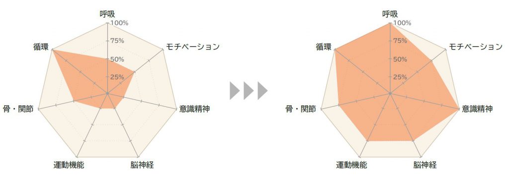 同ガイドラインでは、離床の基礎知識・基礎技術のチェックを一通り終えたら、採点表とレーダーチャートを活用し、苦手分野の分析を行えるようコンテンツを用意。達成項目数とレーダーチャートの変化から、自身が学習すべき項目を洗い出し、さらなるステップアップを目指すことを支援している。