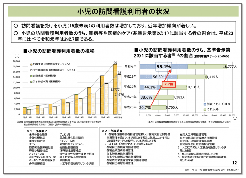 25日に開催された中医協総会では、訪問看護利用者の状況として小児(15歳未満)の利用者数が増加していることも示された。