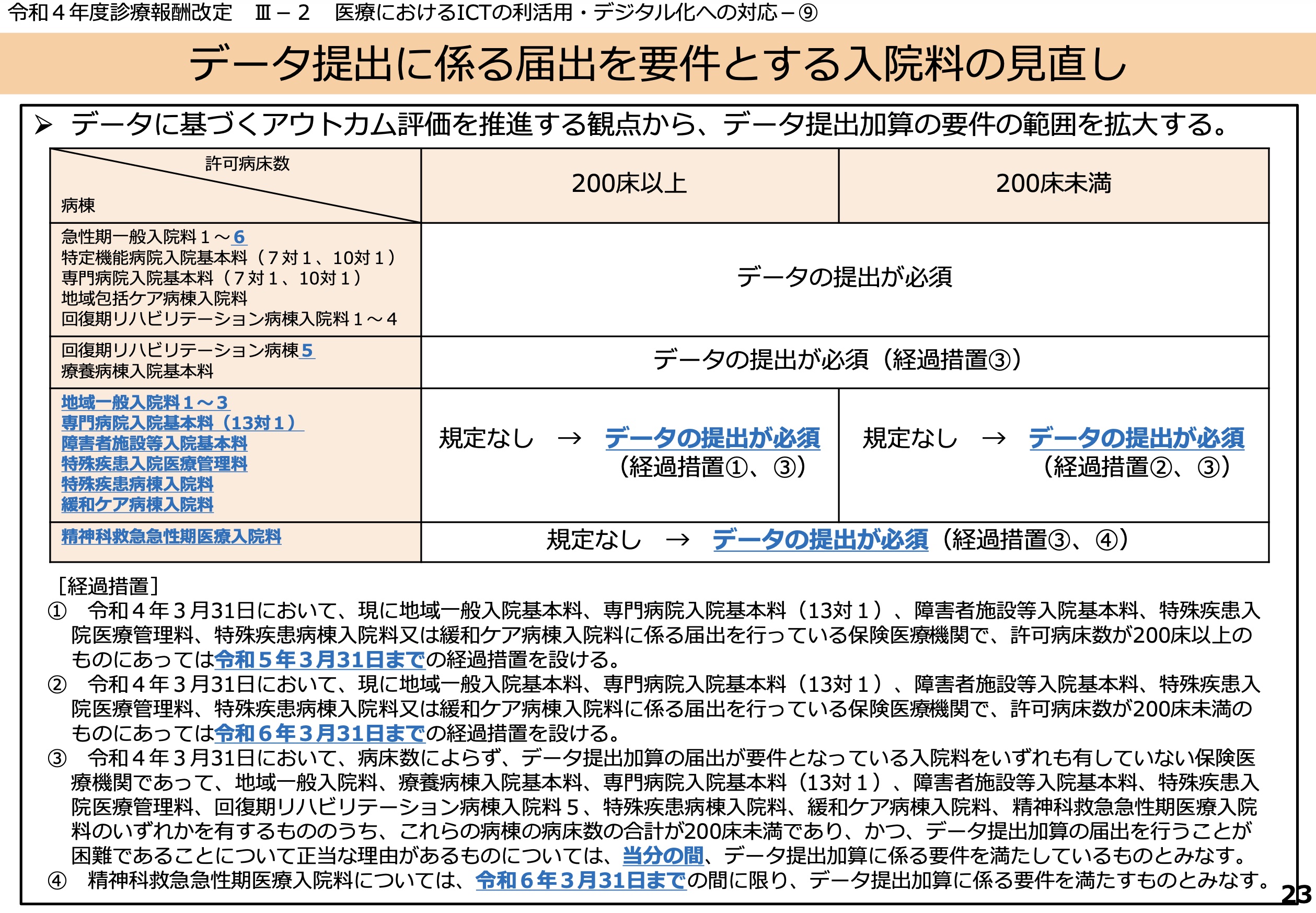 令和4年度改定にて、施設基準の1つとしてデータ提出加算の届出が追加された当該入院料(※)について、引き続き算定するためには、許可病床数が200床以上の場合は令和5年3月31日までに、200床未満のものは令和6年3月31日までにデータ提出加算の届出を行う必要があることを通知した。