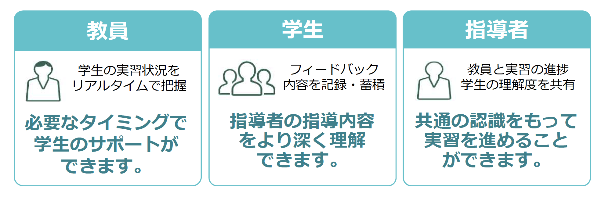 同システムは、臨床実習の新たなコミュニケーションツールとして、実習情報の共有・実習記録のデジタル化を実現。学生・教員・実習指導者の3者間でシステムを利用することで、実習中のデイリーノート・実習チェックリスト・実習評価の情報などをクラウド上でやり取りできるようになる。
