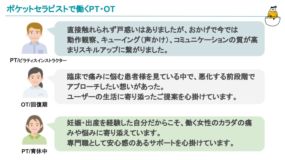 現在では全国200名以上のPT・OTがオンライン健康相談の専門家“ポケットセラピスト”として働き世代へのサポートを始めています。