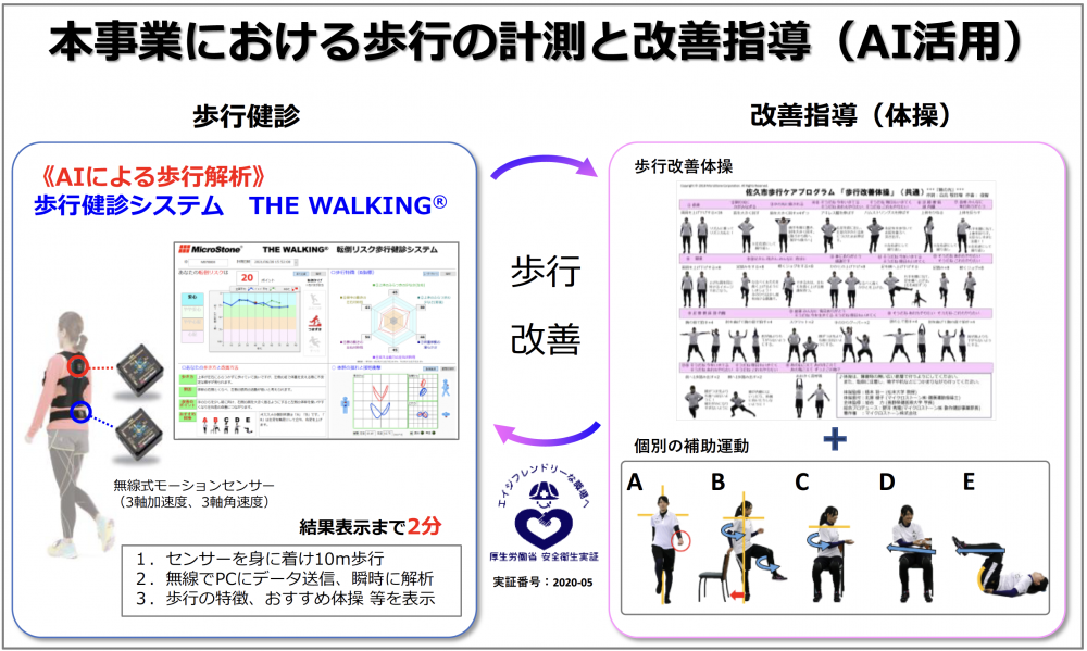 歩行計測には歩行健診システム「THE WALKING」と言う無線式モーションセンサー(3軸加速度)が利用される。測定結果はAIを活用し、その分析結果が約2分程度表示される。