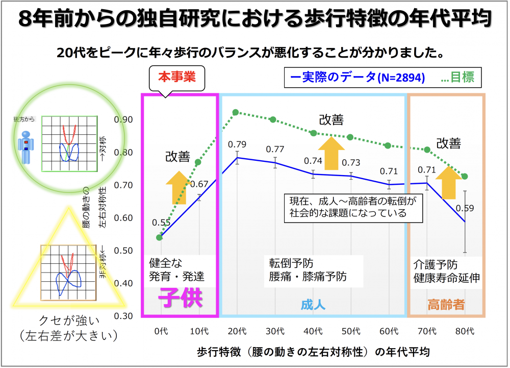 独自研究では、歩行特徴である腰の動きの左右対称性は20代をピークに年々歩行バランスが悪化する結果となった報告している。