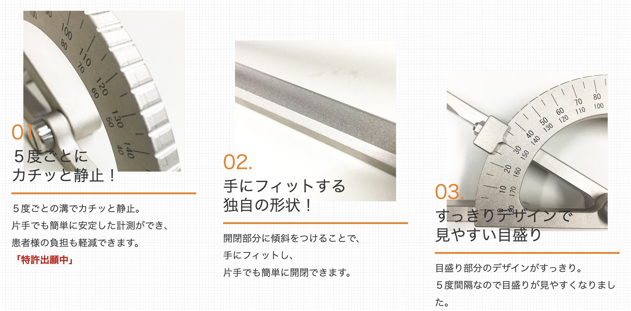 例えば、5度刻みの目盛でカチッと静止するため片手でも安定して測定が可能になり、目盛に溝があるため数字も見やすくなっています。関節可動域(ROM)の測定時間の短縮かつ正確さを求め開発された新しい形のゴニオメーターです。